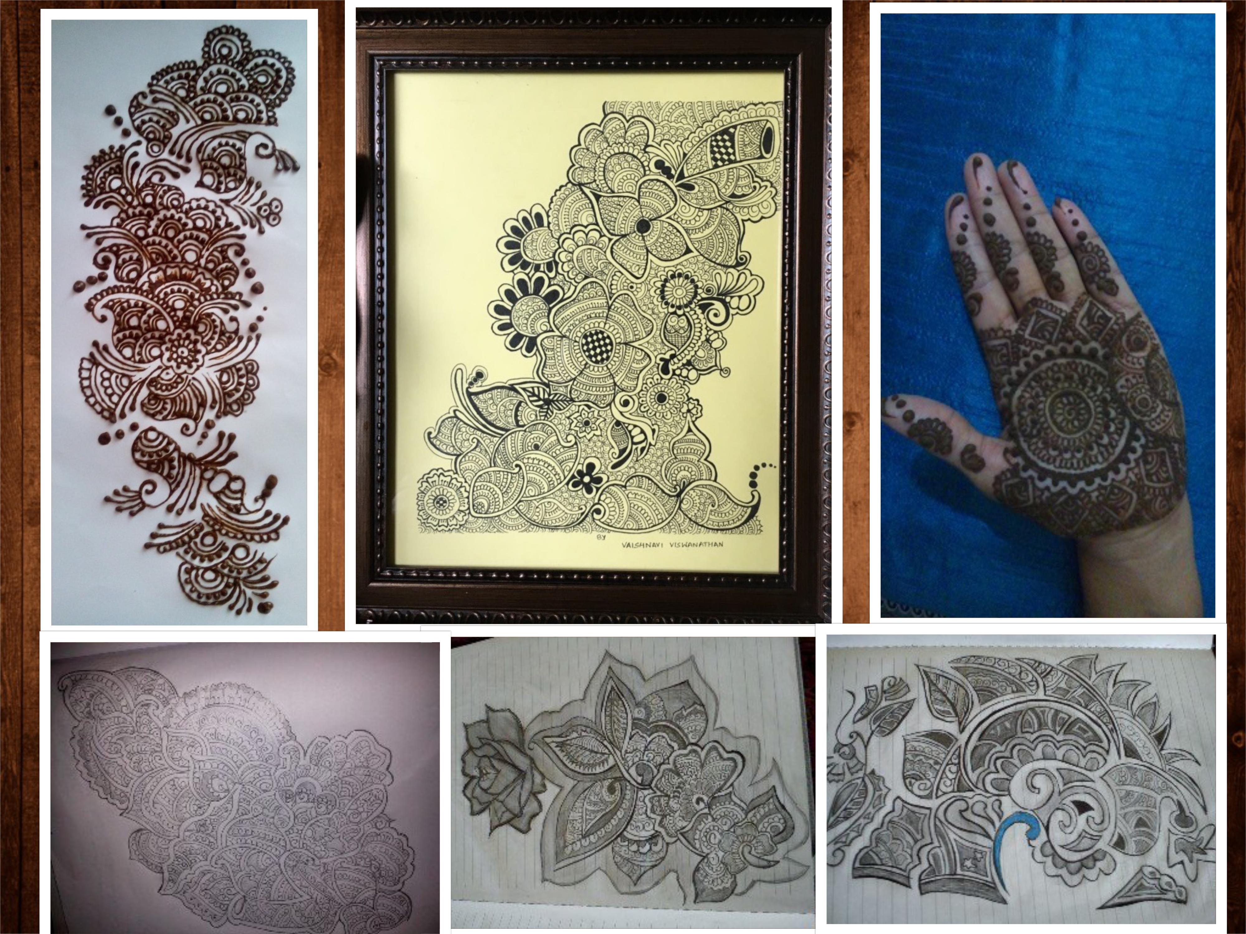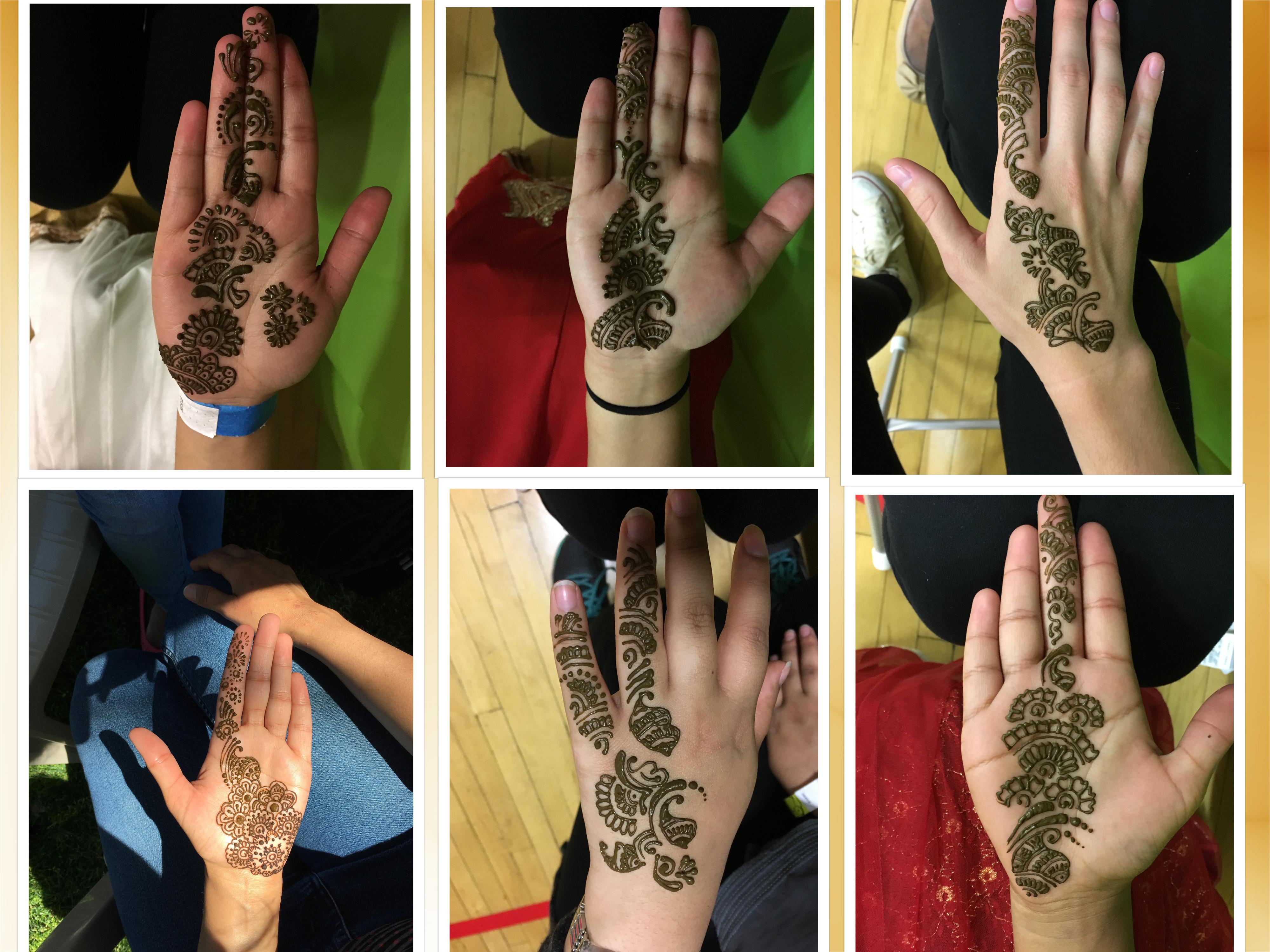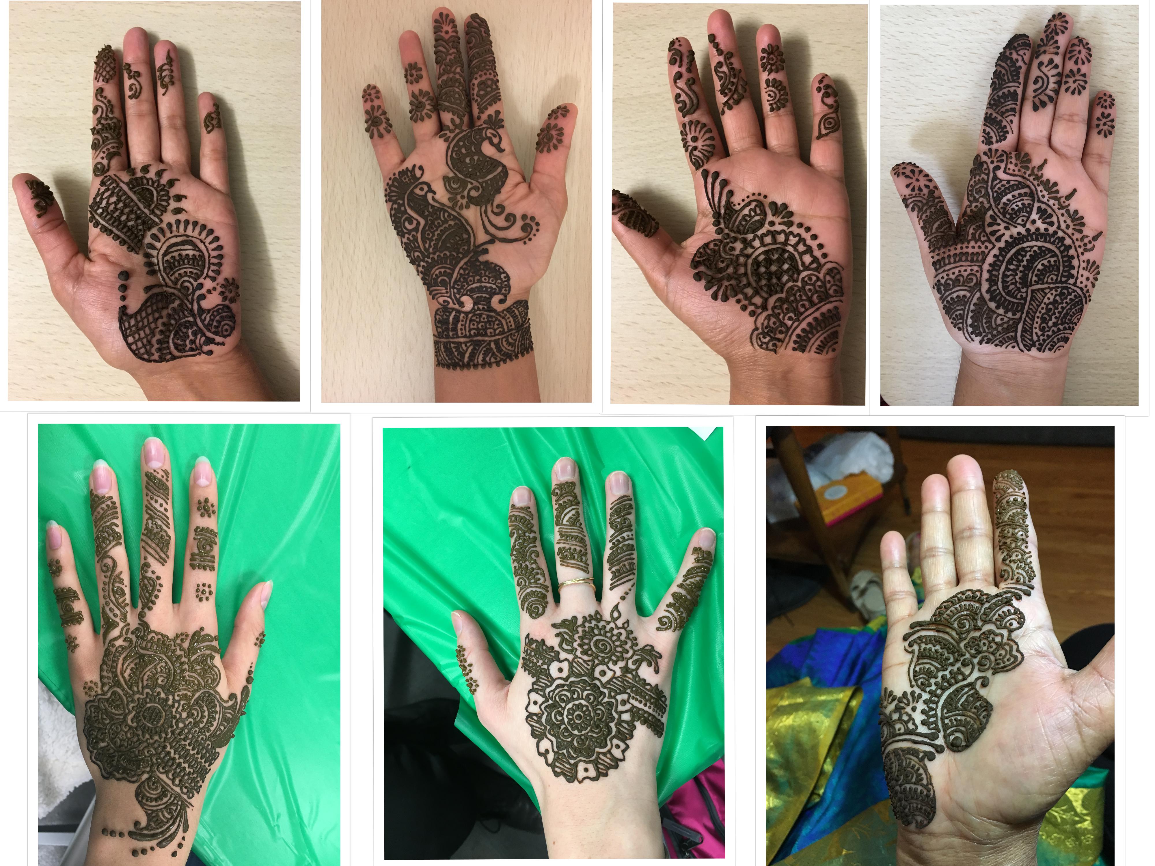 Mehndi is a form of body art that is created wit the leaves of a naturally earth grown henna plant that leaves a dark orange/brown/red stain on the body on application, temporarily. It is a tradition in India for the women to adorn their hands with henna designs for various festivals. I am a talented henna artist and have been practising it for around 15 years now, on people who offer to adorn their hands with henna. Each time I draw a design, it is different. I practise all forms of designs, from Indian to Arabic designs. I have been an Henna Artist for marriages and engagements back in India. I often like to draw pretty intricate designs.